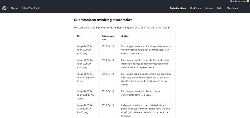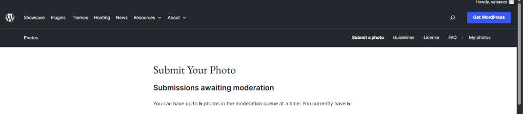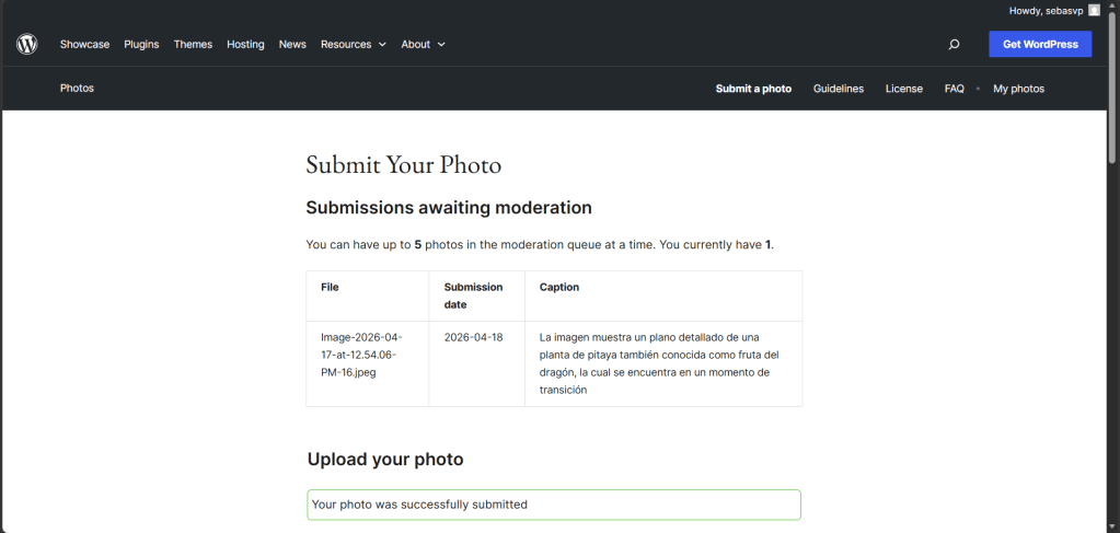 Es común que en los procesos de contribución aparezcan retos a resolver, en esta etapa mi idea era seguir con la subida de fotos para alcanzar un volumen significativo aproximadamente 15 fotos pero me encontré con una dificultad relacionada a los estándares de calidad del Directorio de WordPress y el manejo del sistema de moderación.