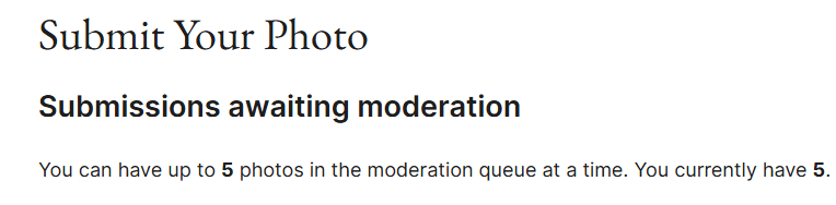 Segunda situación fue el limite de imágenes cargadas, ya que cuando llegue a las 5 fotografías en espera, no me deja subir mas fotos, hasta que me acepten las 5 que ya subí por lo tanto eso causa una pausa prácticamente obligatoria a la carga con un volumen alto de fotografías, tengo que esperar hasta que los moderadores acepten mi carga de trabajo para yo poder continuar con el resto de imágenes.