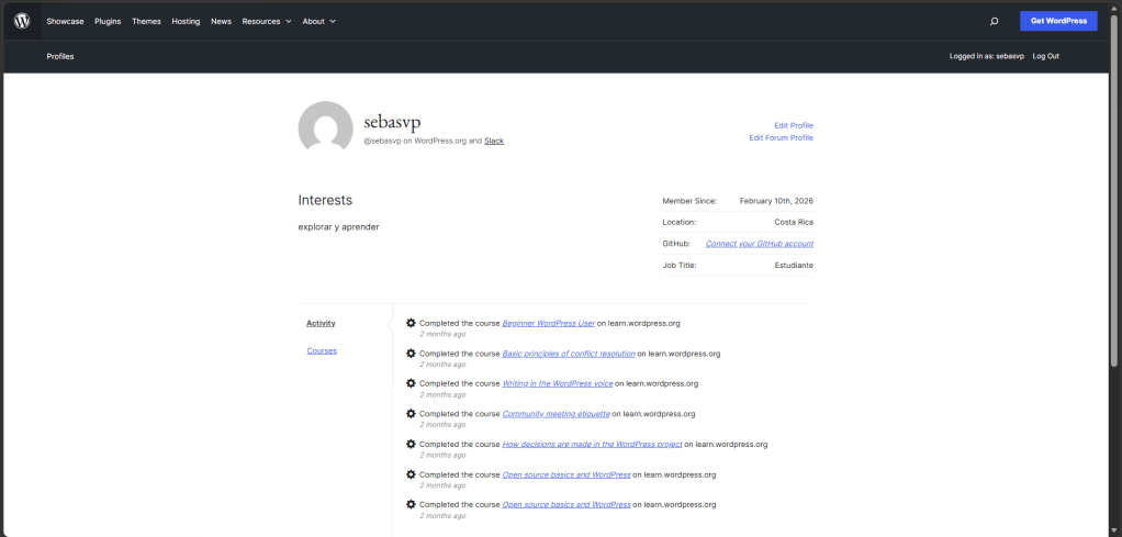 También la creación de la cuenta: Realice el registro de mi perfil oficial en la plataforma de WordPress.org que es donde subo las imágenes y le puedo dar el seguimiento para ver si fueron aprobadas.