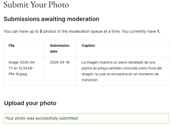 Aprendí que es importante revisar el tamaño del archivo, ya que el mínimo permitido es de 1.00MB y la importancia de conocer lo que fotografiaste porque te piden que des una descripción.